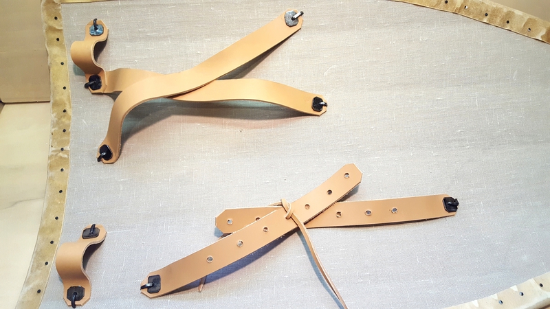Material: Holz, Rinderrohhaut/Pergamenthaut , Leder, Leinen, Schmiedenägel+ kleine Nägel für den Rand,