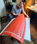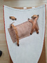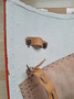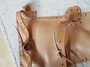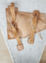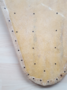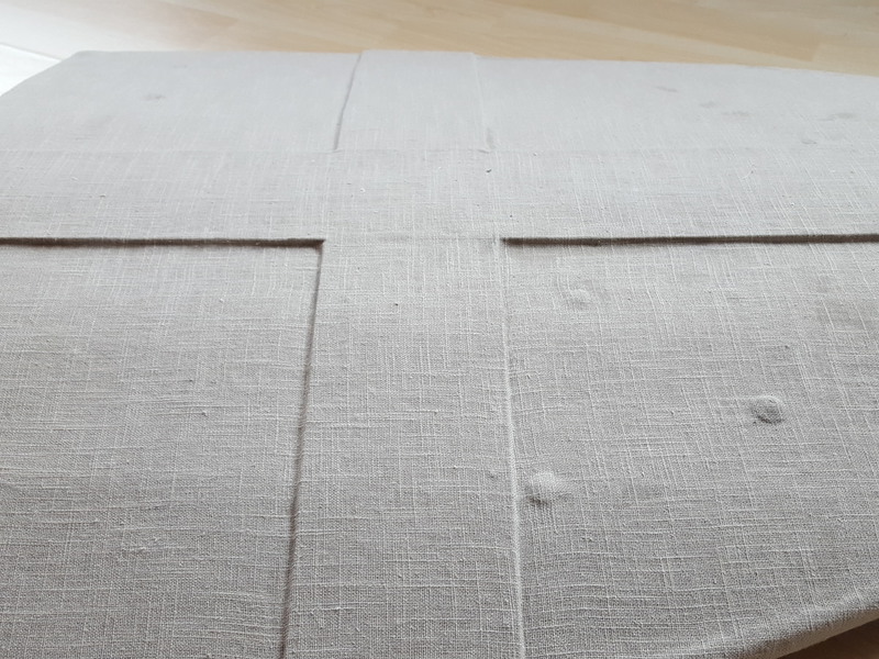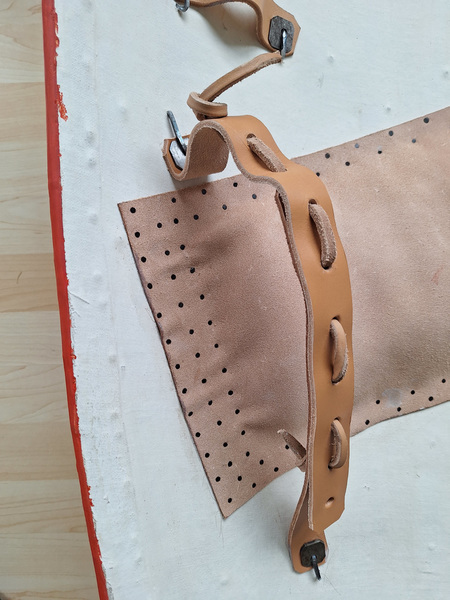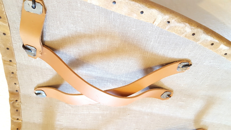 Material: Holz, Rinderrohhaut geschliffen, Leder, Leinenstoff, Schmiedenägel+ kleine Nägel für den Rand