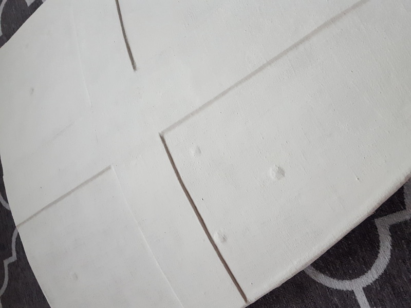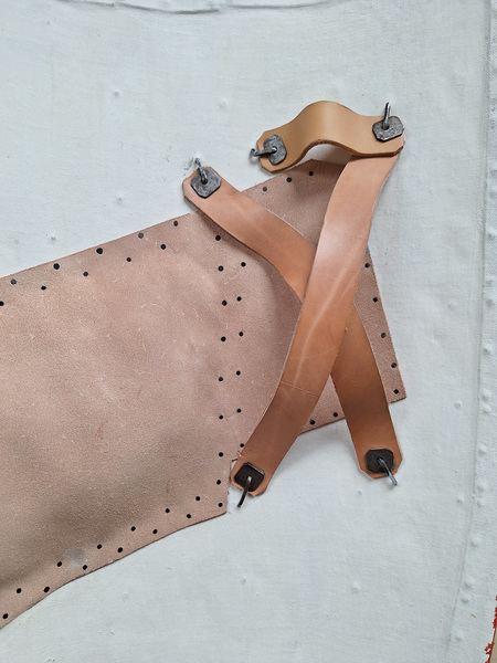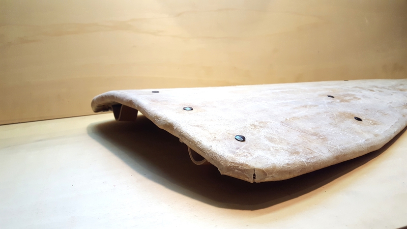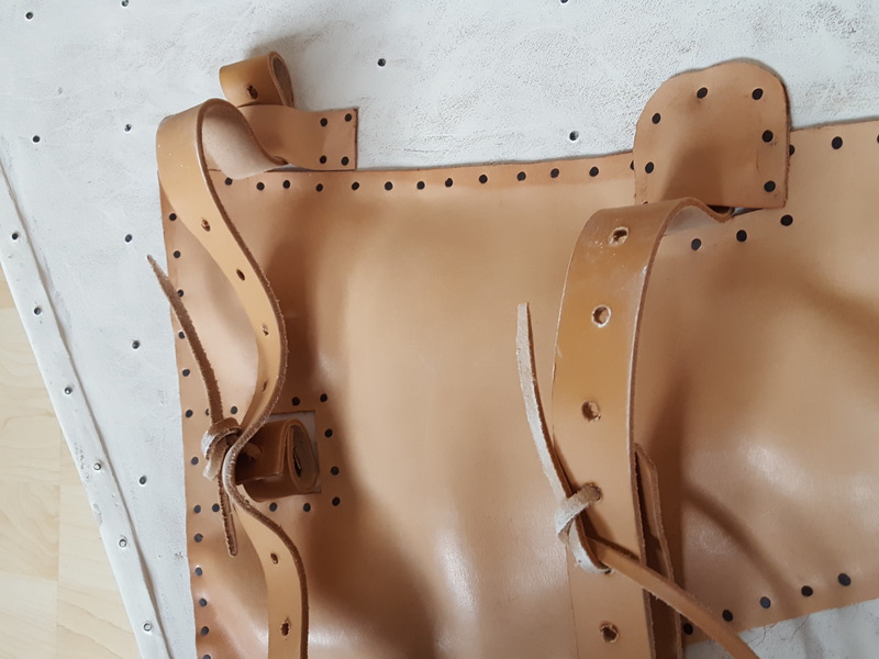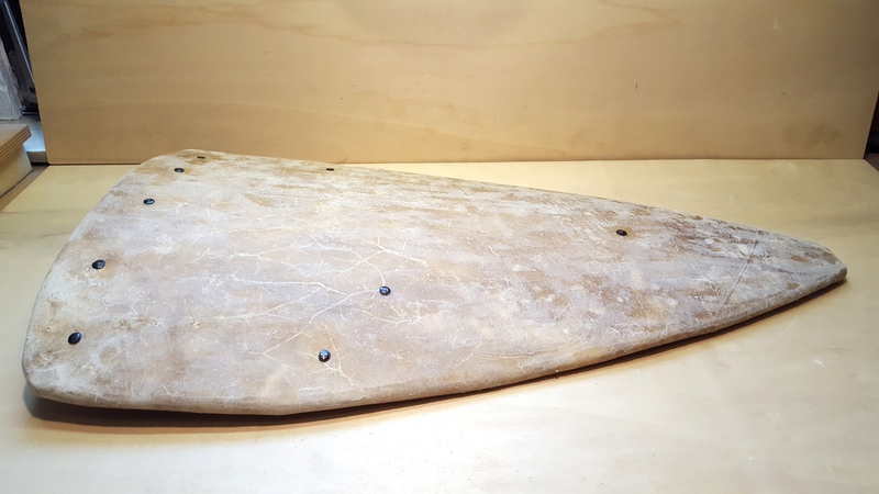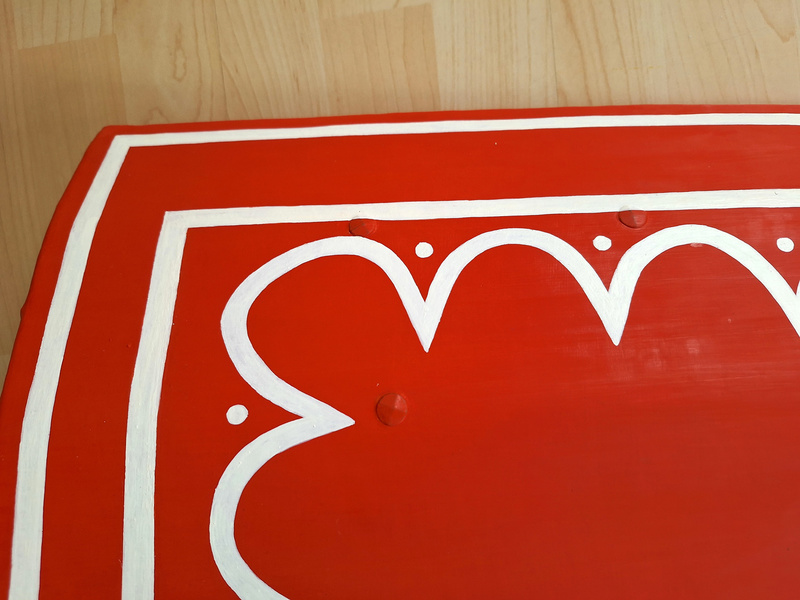 Material: Holz, Rinderrohhaut/Pergamenthaut , Leder, Leinenstoff, Schmiedenägel+ kleine Nägel für den Rand,Kreide,Leim,Schutzanstrich